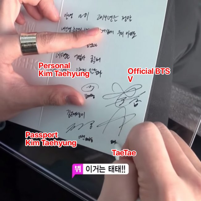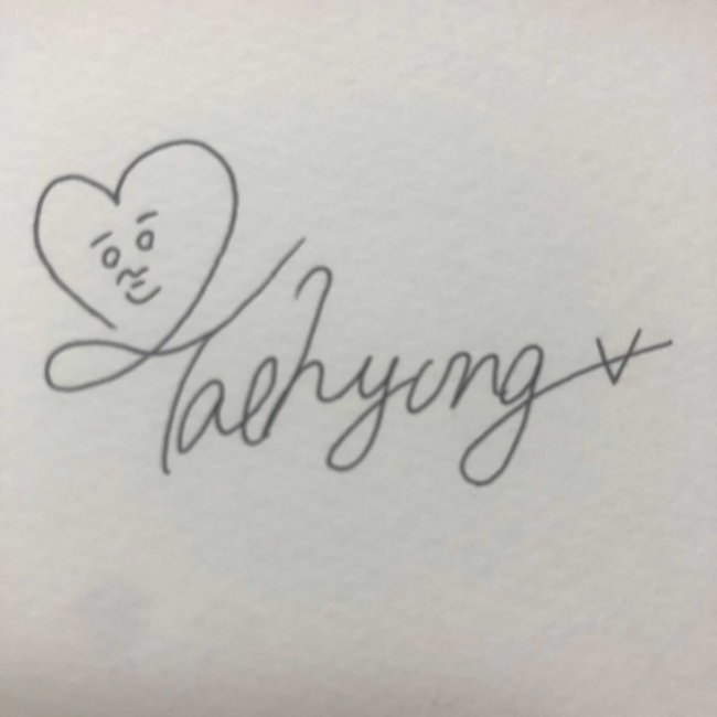 На данный момент у музыканта есть четыре известные подписи, которые он использует в разных случаях. У него есть официальная подпись, которой он расписывается, как участник BTS, паспортная, персональная и маленькая для TaeTae. Однако их ему недостаточно.